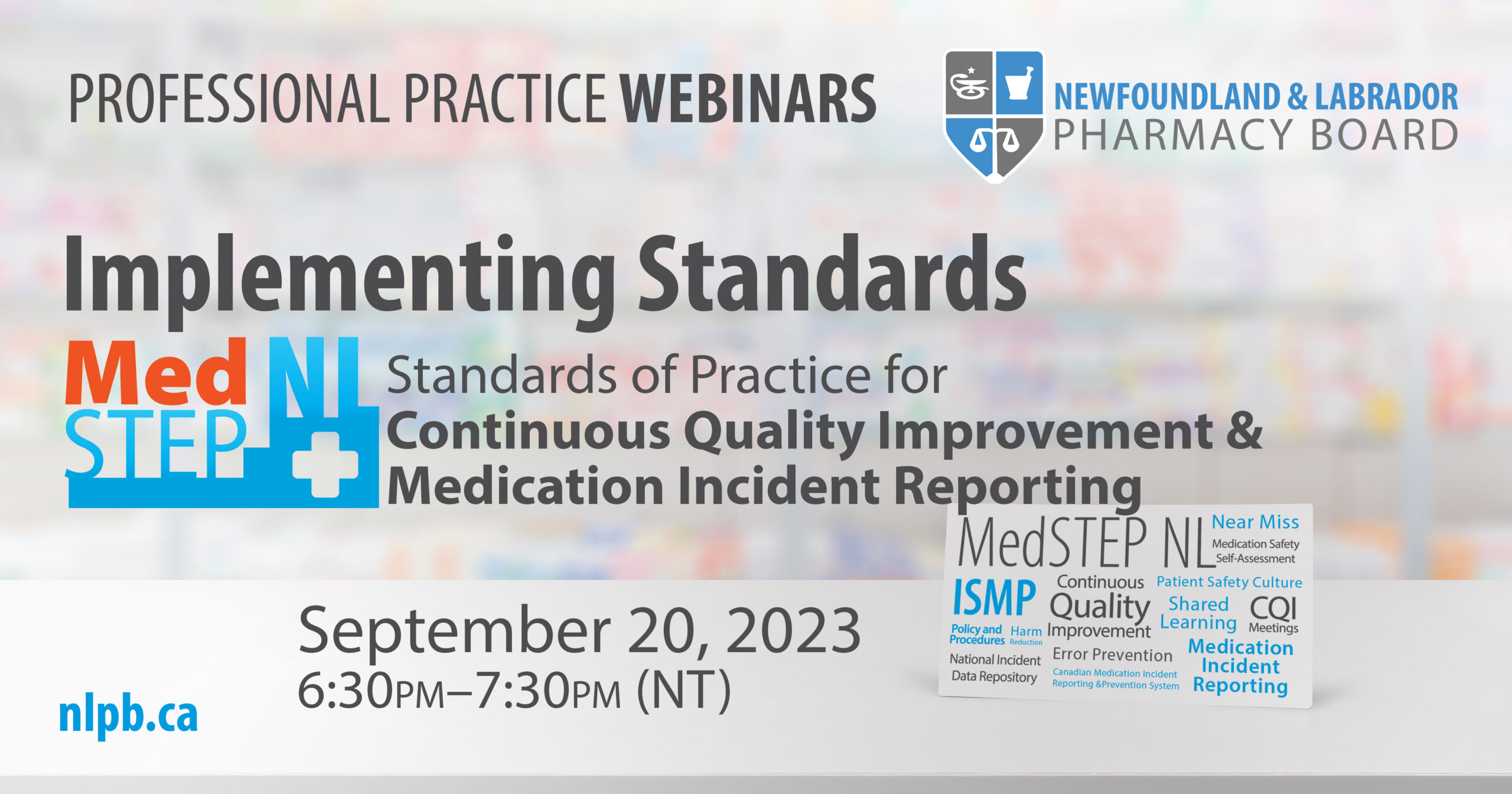 Join NLPB and ISMP Canada for a review of the continuous quality improvement and medication incident reporting program for community pharmacies, MedSTEP NL, on Wednesday, September 20, 2023, 6:30-7:30pm (NDT). In this webinar, NLPB’s Director of Quality and Pharmacy Licensing, Kelda Newport, and ISMP Canada’s Director of Community Pharmacy Reporting and Learning, Enna Aujla, will review: